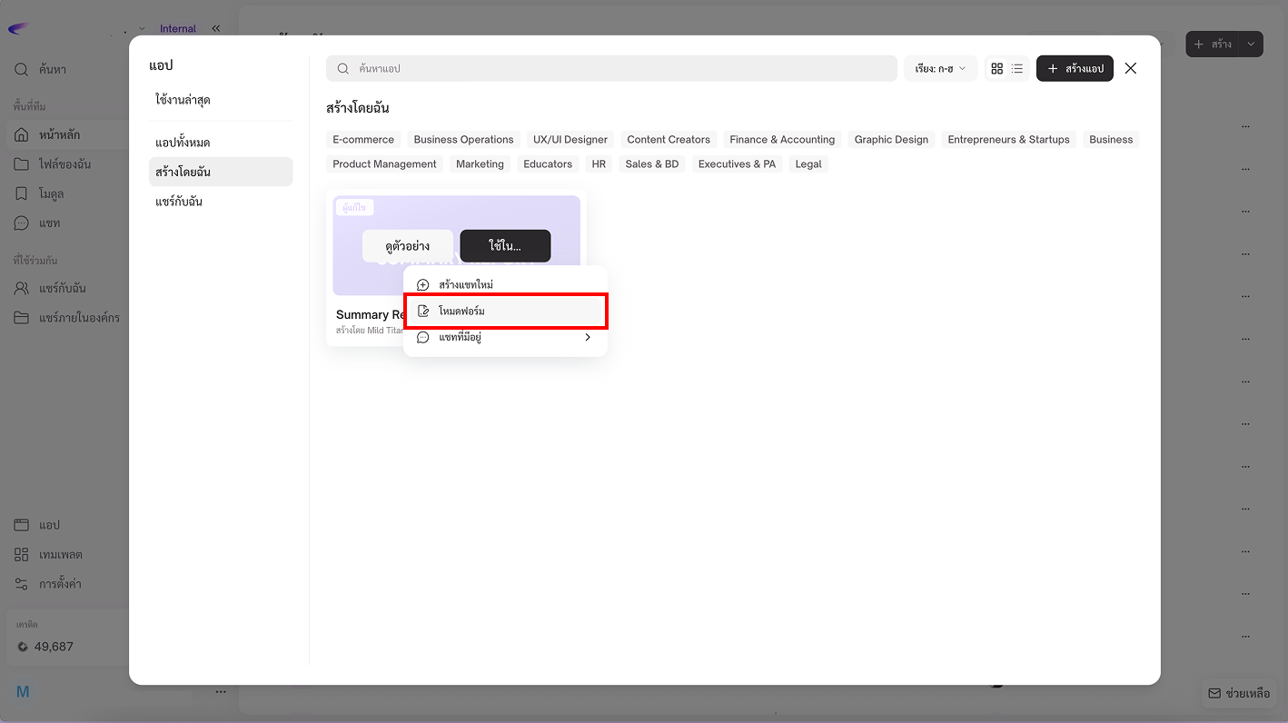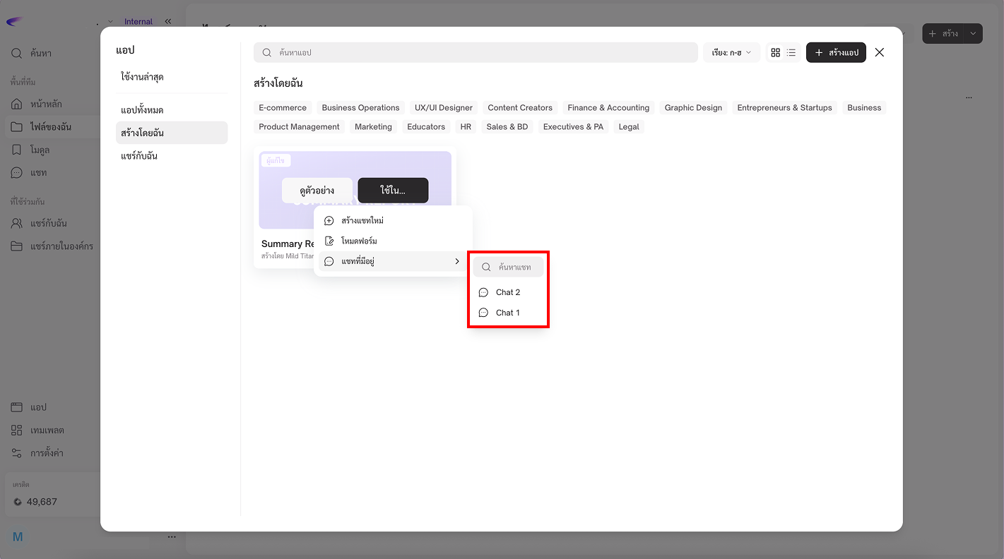 * แชทที่มีอยู่: เลือกใช้งาน App นี้ในแชทที่มีอยู่แล้ว เพื่อทำงานต่อจากบทสนทนาเดิม