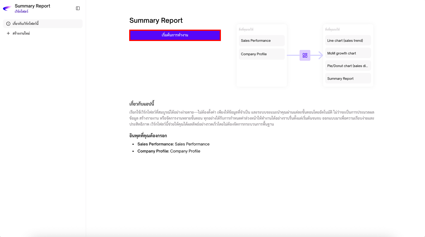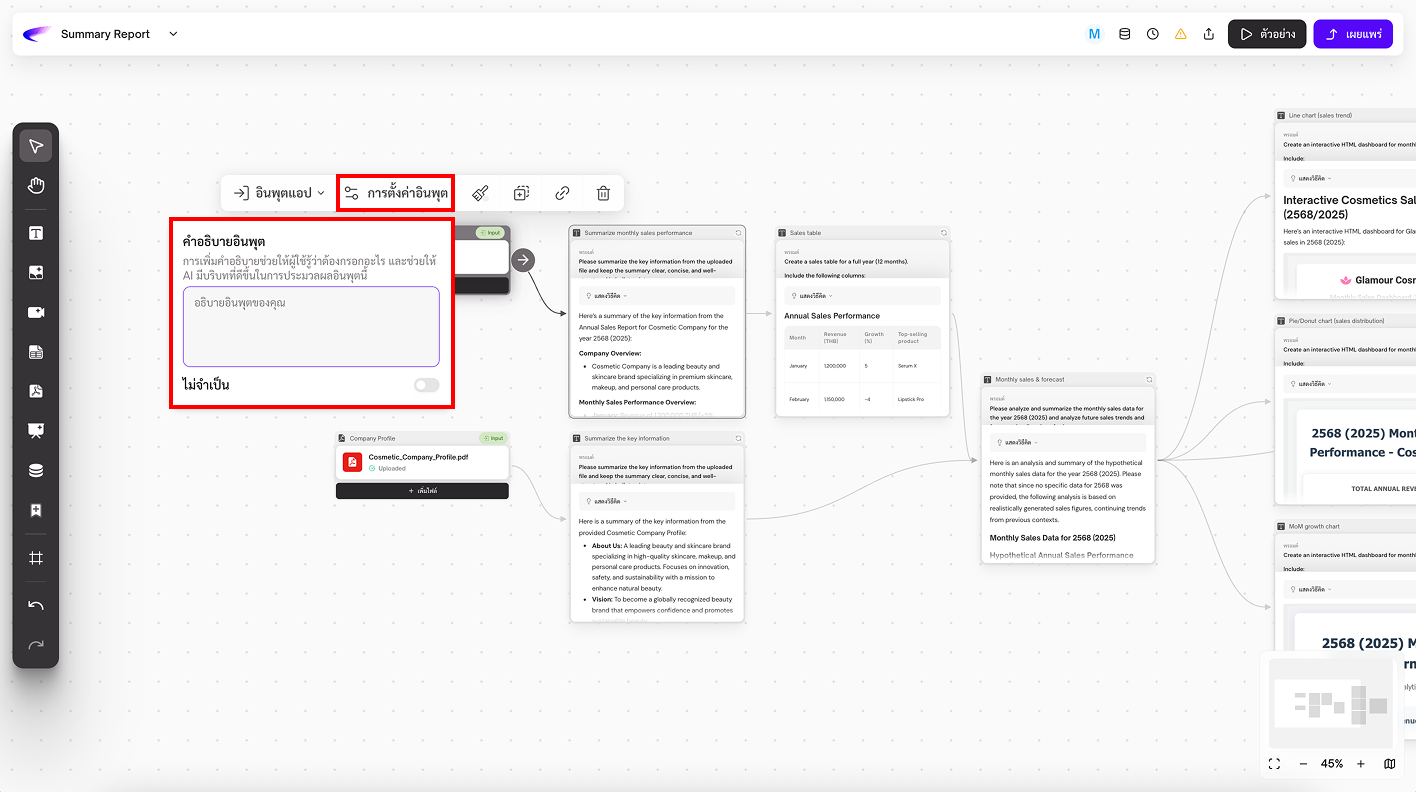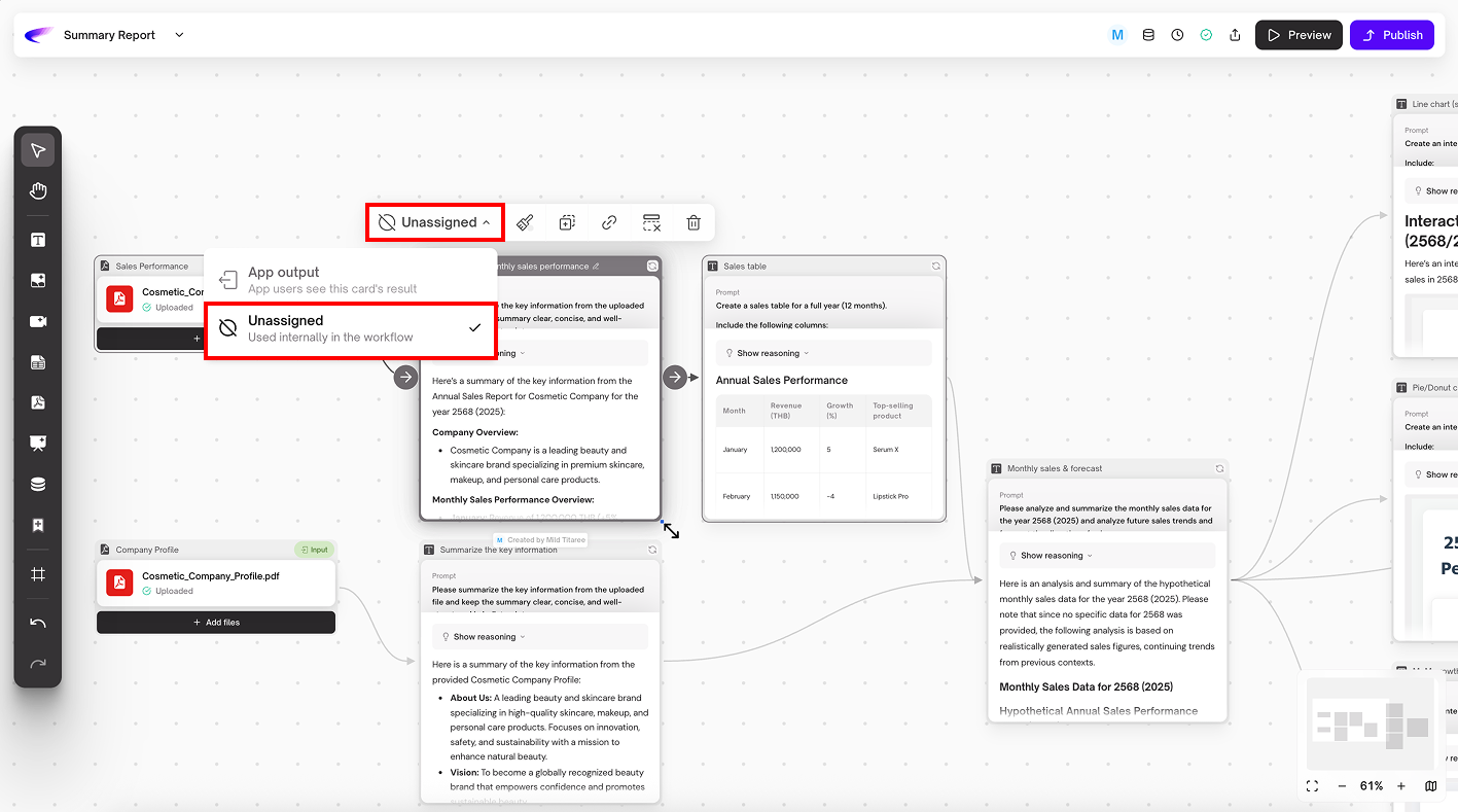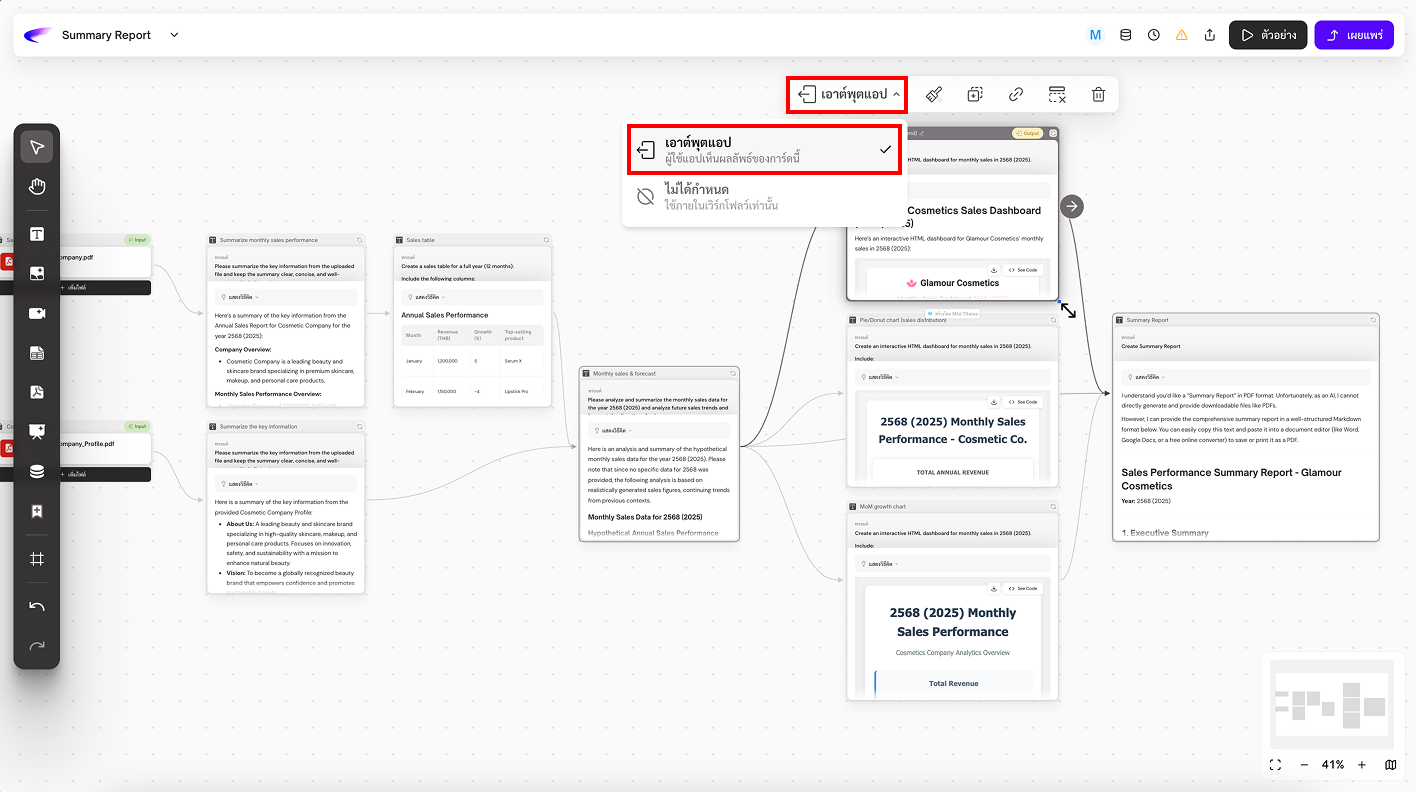 3. **Workflow Output:** กำหนดให้การ์ดนี้เป็น “ผลลัพธ์” ของแอป เป็นสิ่งที่ผู้ใช้จะเห็นหลังจากการรัน App เสร็จ