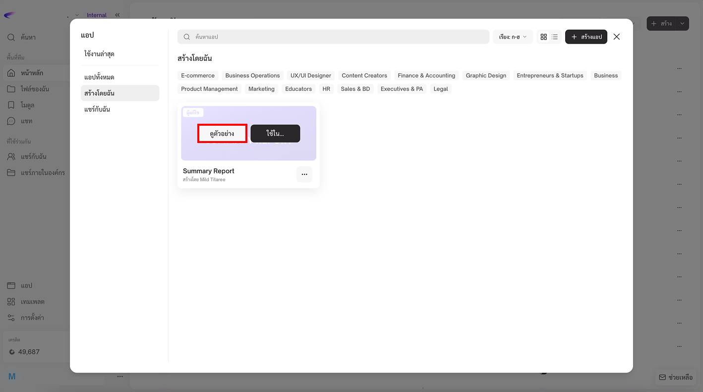 คุณสามารถคลิก **"ดูตัวอย่าง"** เพื่อสำรวจ App ก่อนใช้งาน หรือกดปุ่ม **“ใช้ใน…”** เพื่อเริ่มใช้งาน App