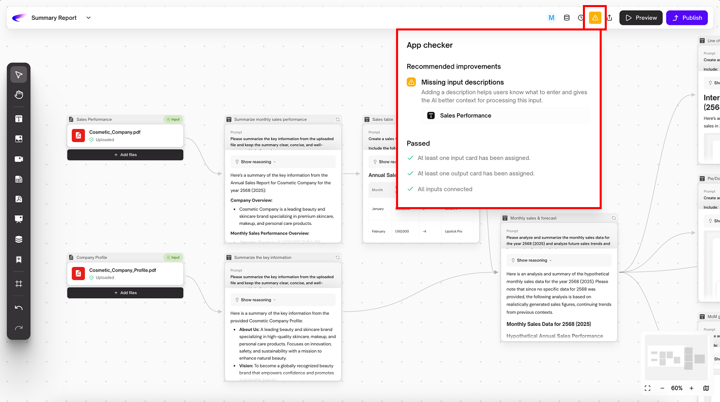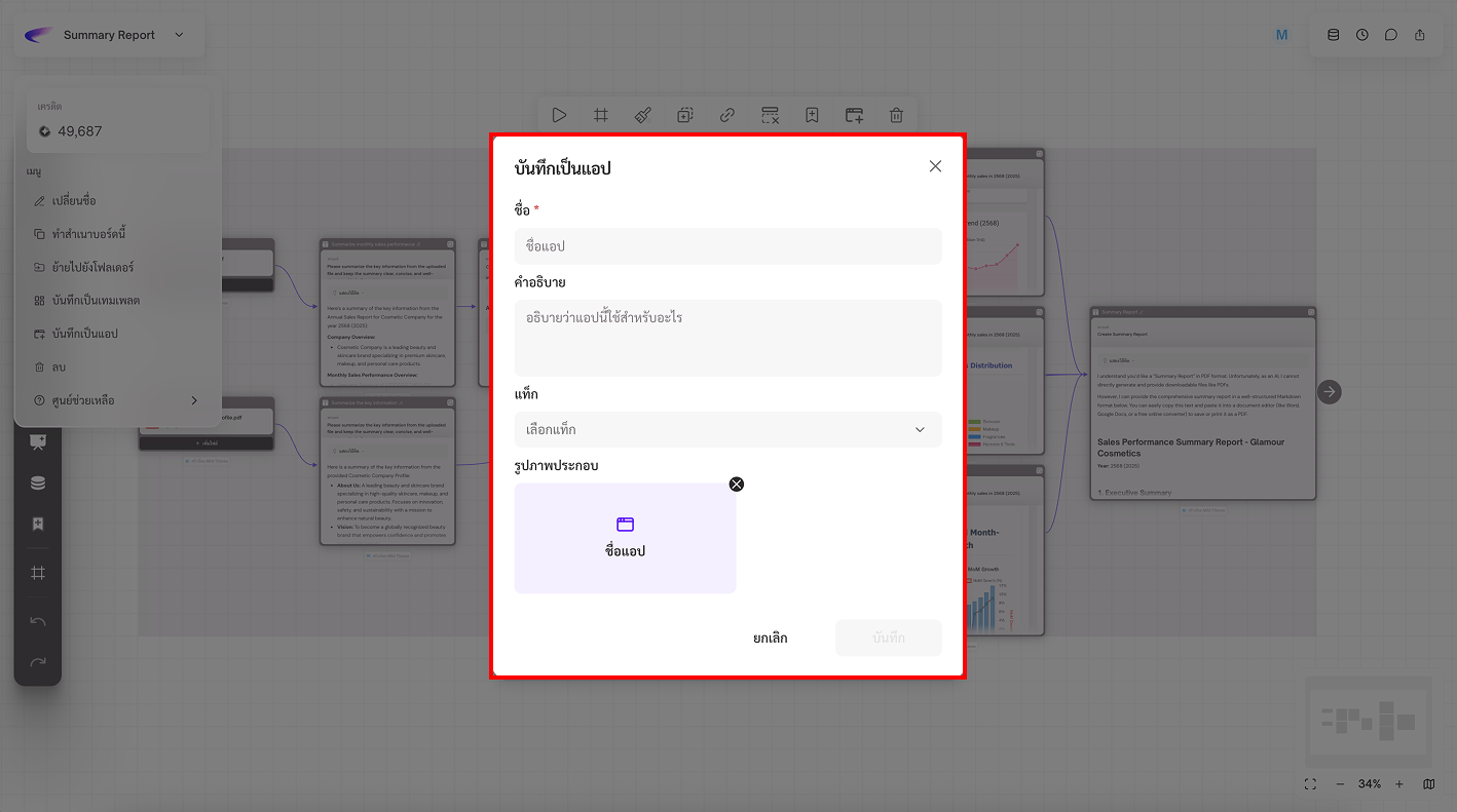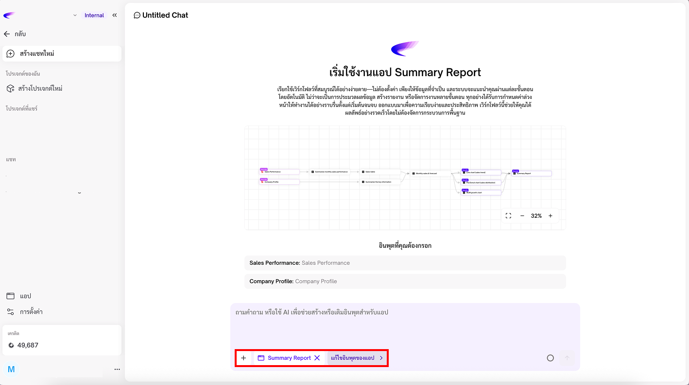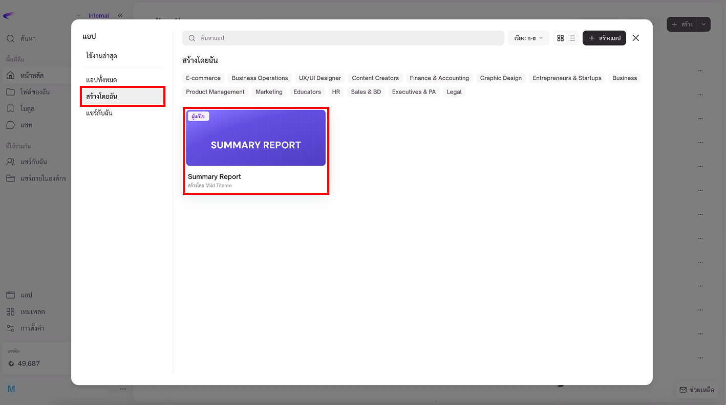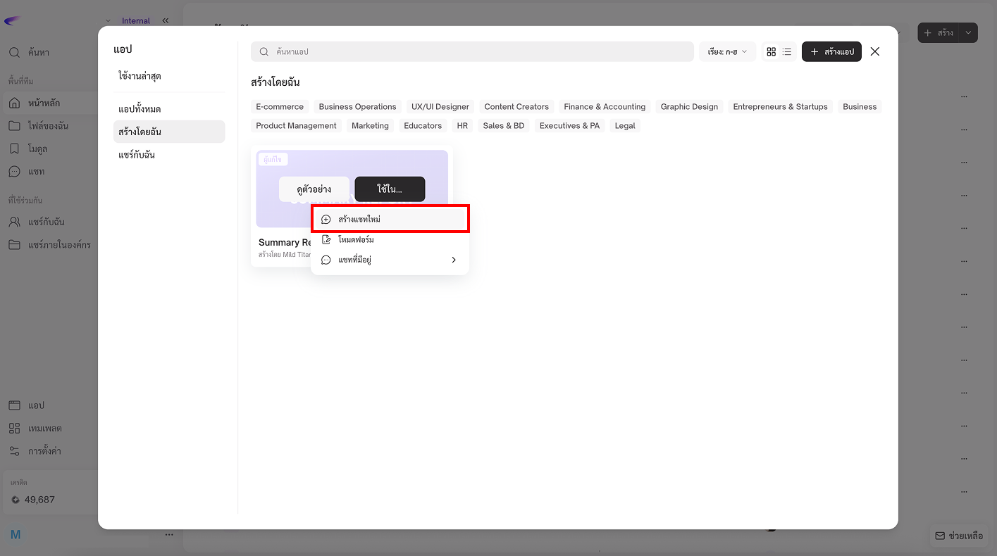 App คือเครื่องมือที่ช่วยให้คุณทำงานได้ง่ายและเร็วขึ้น โดย AI จะทำงานตามขั้นตอนที่กำหนดไว้ล่วงหน้า คุณสามารถใช้ App ได้ในแชทเดียว เพื่อช่วยงานต่าง ๆ เช่น สรุปข้อมูล วิเคราะห์ไฟล์ หรือสร้างเอกสาร โดยไม่ต้องพิมพ์คำสั่งซ้ำ ๆ หรือทำเองทุกขั้นตอน