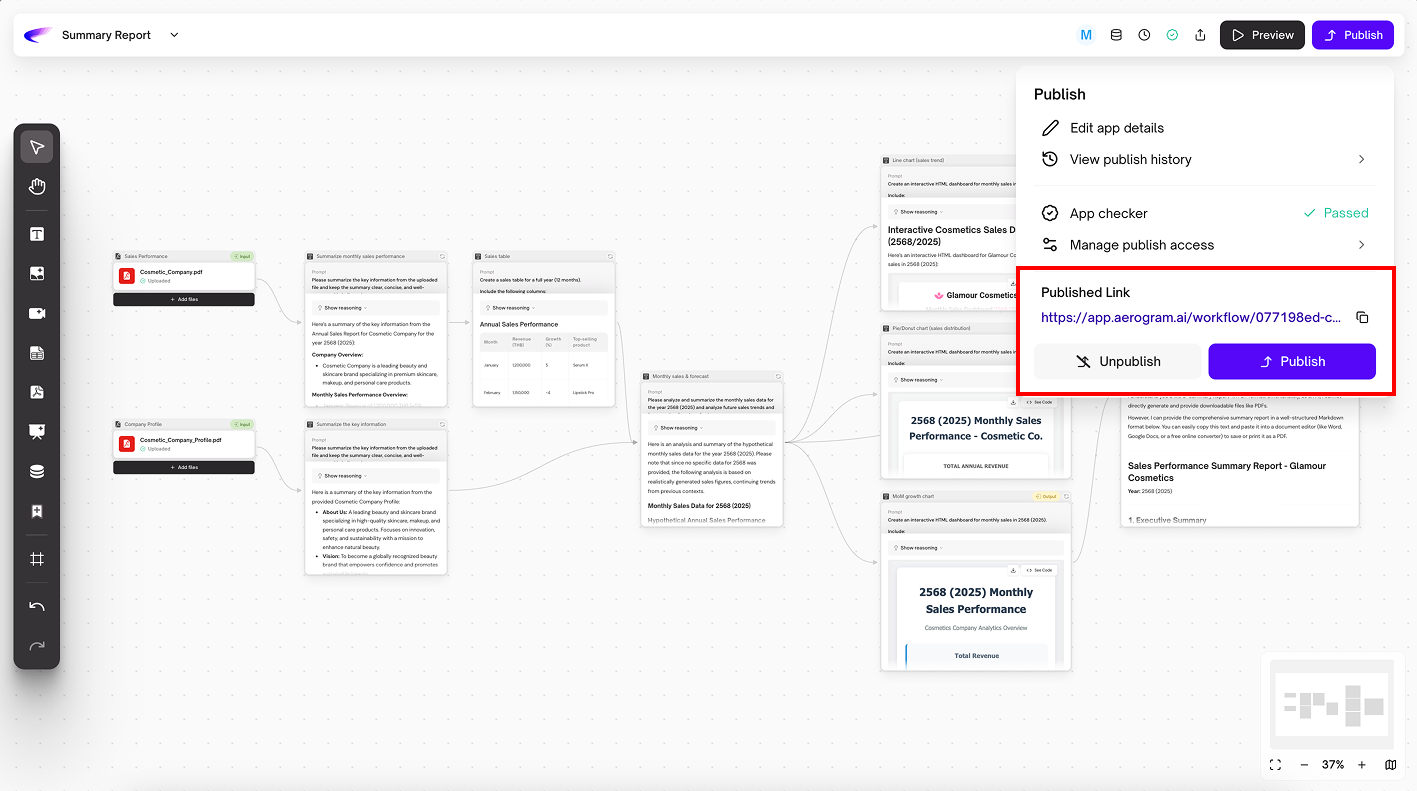 เราสามารถกำหนดสิทธิ์ให้ผู้อื่นสามารถเข้าถึงและใช้งาน App ได้โดยการกดปุ่ม **“Publish”** และกด **"Copy Link"** เพื่อทำการเผยแพร่ หรือกด **“Unpublish”** เพื่อยกเลิกการเผยแพร่ App